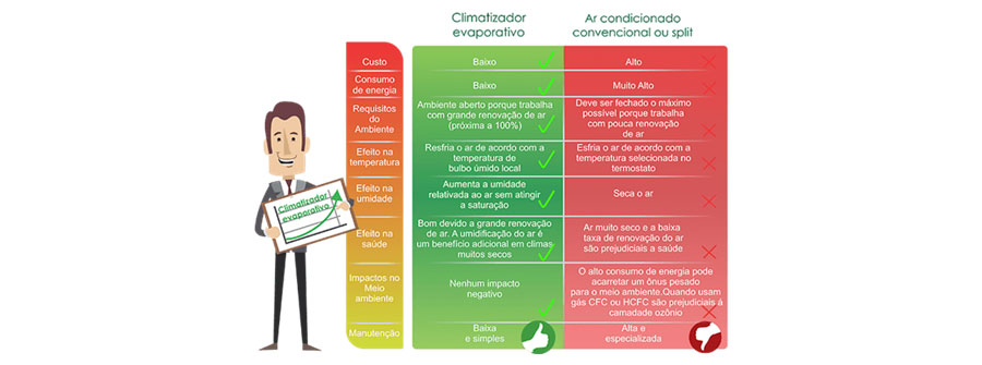 O ar condicionado convencional consome energia até 10 vezes mais que o climatizador evaporativo. Além do baixo consumo de energia, os climatizadores evaporativos não produzem nenhum tipo de gás